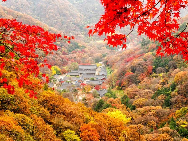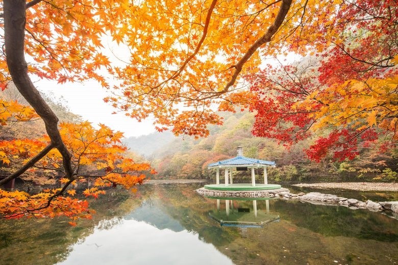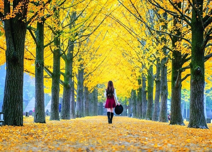 Đảo Nami là điểm đến không thể bỏ qua, nơi từng xuất hiện trong nhiều bộ phim tình cảm nổi tiếng. Con đường thẳng tắp hai bên là hàng ngân hạnh vàng óng hay hàng phong đỏ rực, khiến du khách ngỡ như đang bước vào thế giới điện ảnh. Nếu muốn tìm đến không gian hoang sơ và hùng vĩ hơn, dãy Seoraksan là nơi tuyệt vời để ngắm toàn cảnh núi rừng mùa thu từ trên cao.